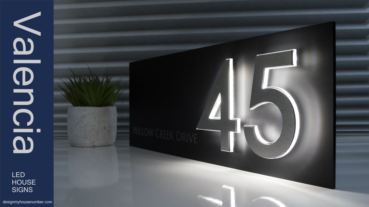 The Valencia house sign is a true head-turner and for good reason. Its bold, modern aesthetic is crafted from premium matte-finish acrylic and features elegant, LED-illuminated floating numbers paired with personalised address details. Each sign is one-of-a-kind, made to order using our intuitive online designer tool. Choose from a wide range of finishes, colours, and fonts to create a look that perfectly suits your style. Discover the ideal blend of craftsmanship, quality materials, and custom design, all in one stunning sign.